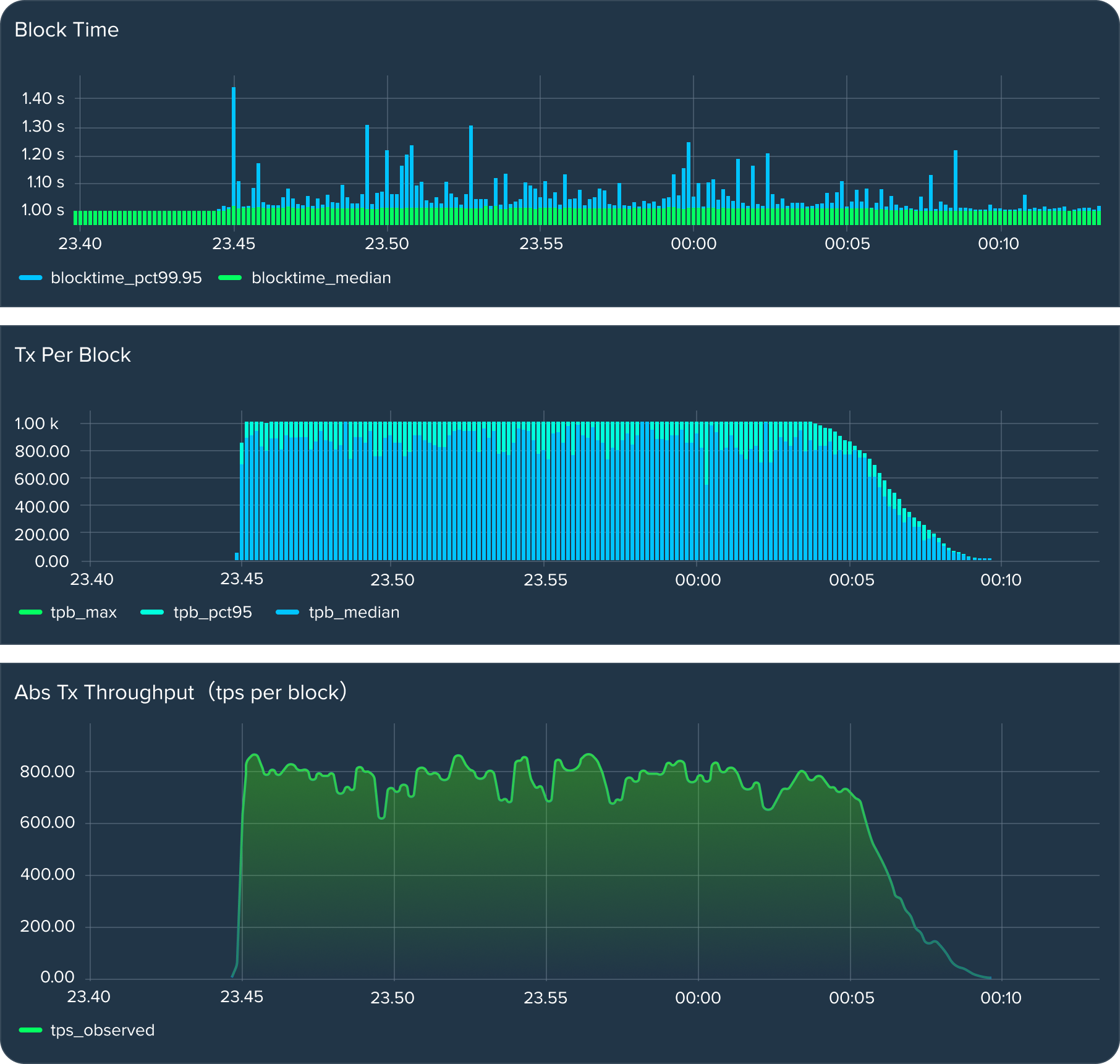 The second phase simulated Injective’s mainnet conditions in an end-to-end environment using a full, 3-node local consensus setup. Critical settings were chosen to mirror mainnet conditions, most importantly: