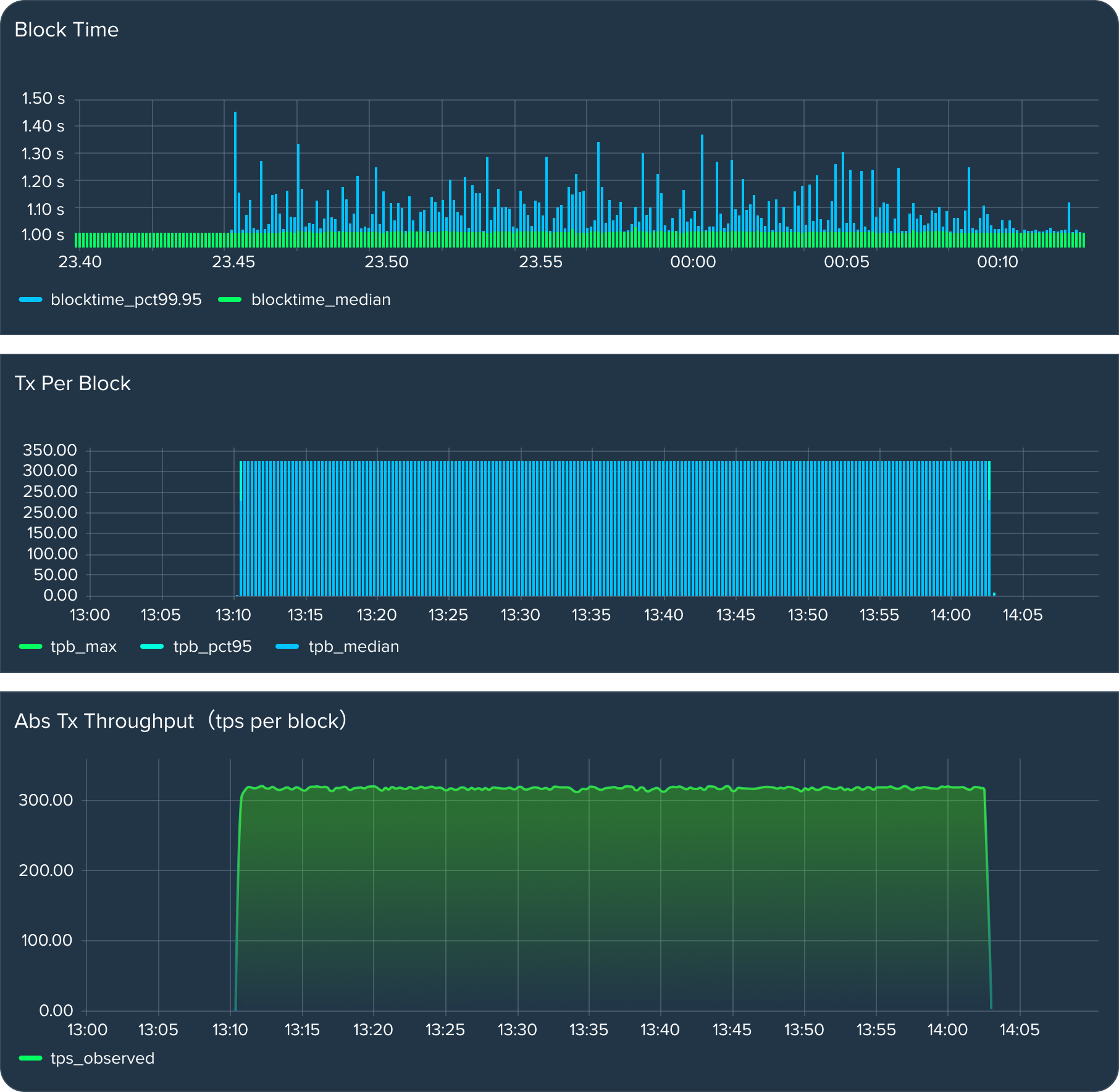 Note: Increasing the gas limit per block or expanding the mempool capacity could technically allow for a higher transaction volume; however, this significantly impacts the BFT consensus layer, introducing substantial overhead that offsets the advantages of added transaction throughput. For example, while it would be possible to fit 10,000 EVM transactions within a single block, the block propagation time would increase to around 10 seconds, leading to delays in finality. To maintain an optimal balance between performance and network stability, test parameters were chosen to align with mainnet settings, ensuring consistent chain stability while handling a substantial volume of EVM transactions.